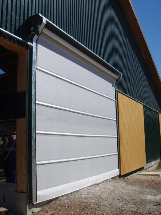 Används med vindnät för ökad ventilation eller förstärkta, täta rullportar för att klara även hårda vindar. Fördelen med rullportar är att de är platsbesparande och prisvärda. Går att få till maskinhall med storlek om upp till hela 10x75m!